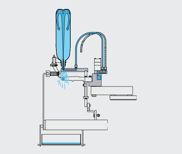 In a special variant of the two-channel rinser with eletropneumatic control, ionised air can also be used as rinsing medium for PET bottles. Precipitating particles of dust are sucked from the second channel. Using air as the rinsing medium makes CIP and foam cleaning superfluous.