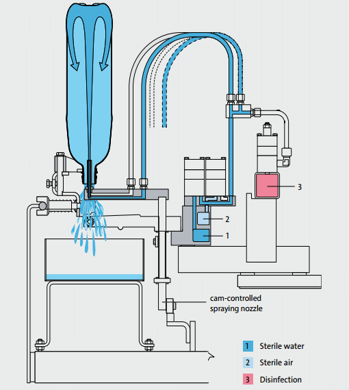 There is no need to replace the spacing starwheel when changing container sizes. Following bottle inversion where the containers are swung upwards through 180°, the actual cleaning process starts. The spraying nozzle is positioned directly underneath the neck finish for injecting the particular rinsing medium into the bottle. The spraying nozzles are supplied with medium from the rotary media manifold. Following these treatment phases, the bottle is returned to the upright position and transferred to the discharge starwheel. For versions with an electro-pneumatic control unit, a user-adjustable rinsing angle is available for the cleaning steps. The respective treatment times can be defined individually